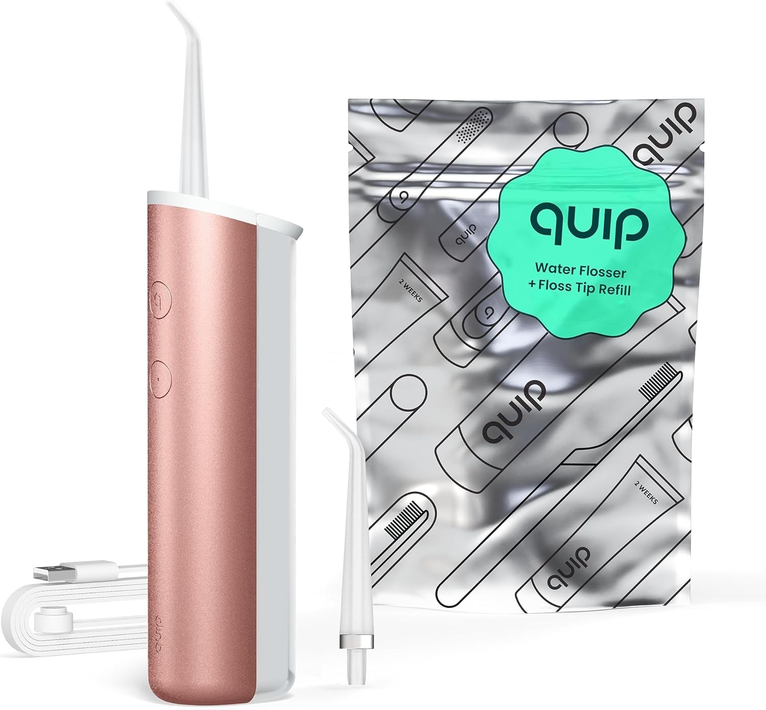 Includes 1 cordless flosser, 1 standard nozzle, 1 Quad Stream nozzle, 1 USB-A charging cable, and 1 wall adapter.